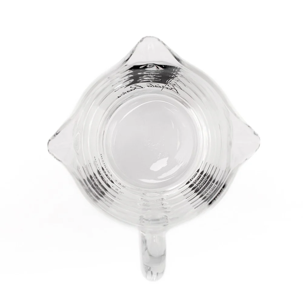 Barista Basics 3oz Shot Glass. This heat resistant shot pitcher has everything you need with a handle and three pour spouts. Graduated marks read in ounces and milliliters for all your measuring needs. Ounces are marked at every 1/2oz. Milliliters are marked at every 10ml.